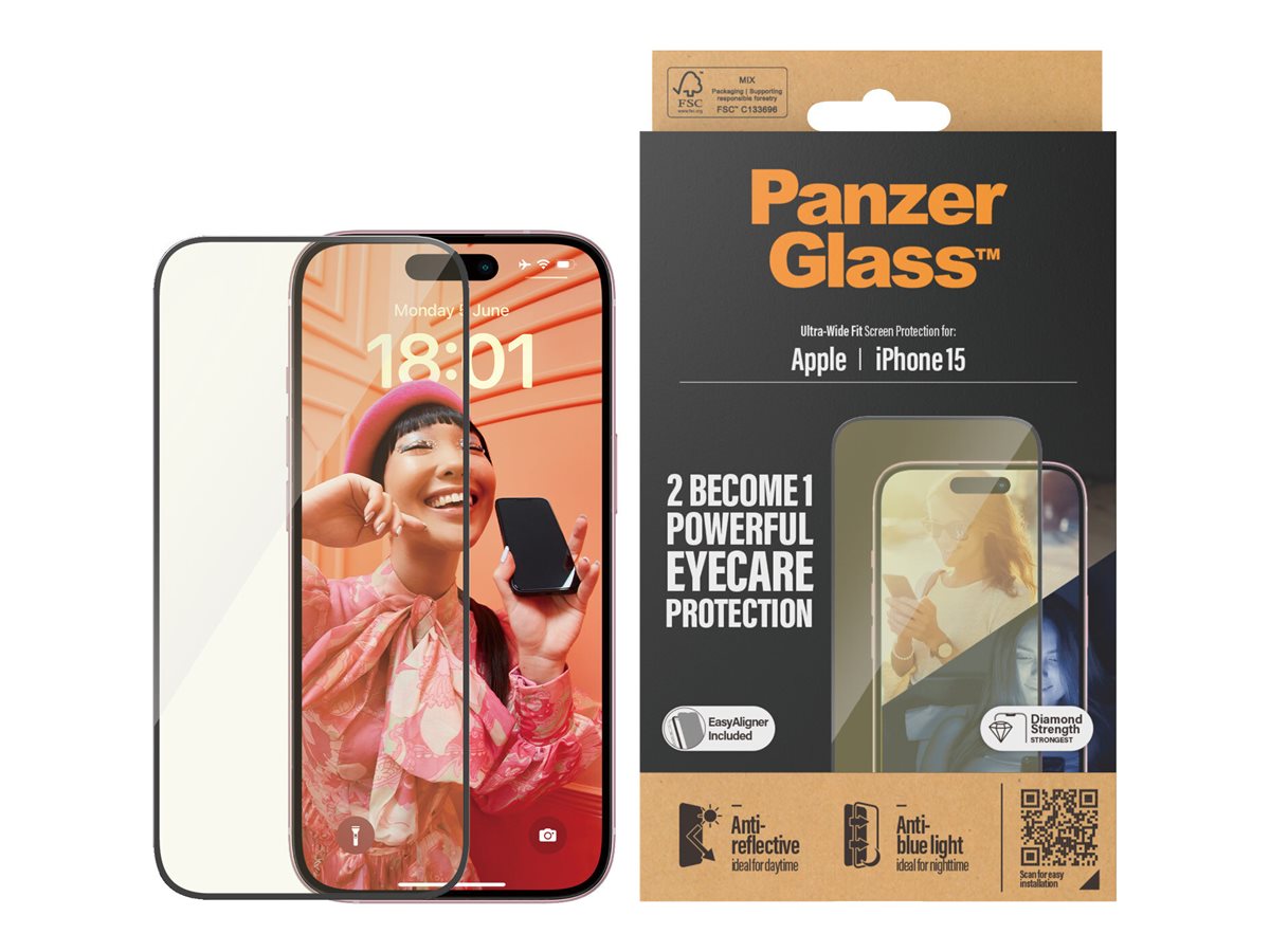 PanzerGlass | Screen protector | Apple | iPhone 15 | Glass | Clear | Ultra-Wide Fit; Easy installation; Fingerprint resistant; Anti-blue light; Anti-reflective; Anti-yellowing | Eyecare
