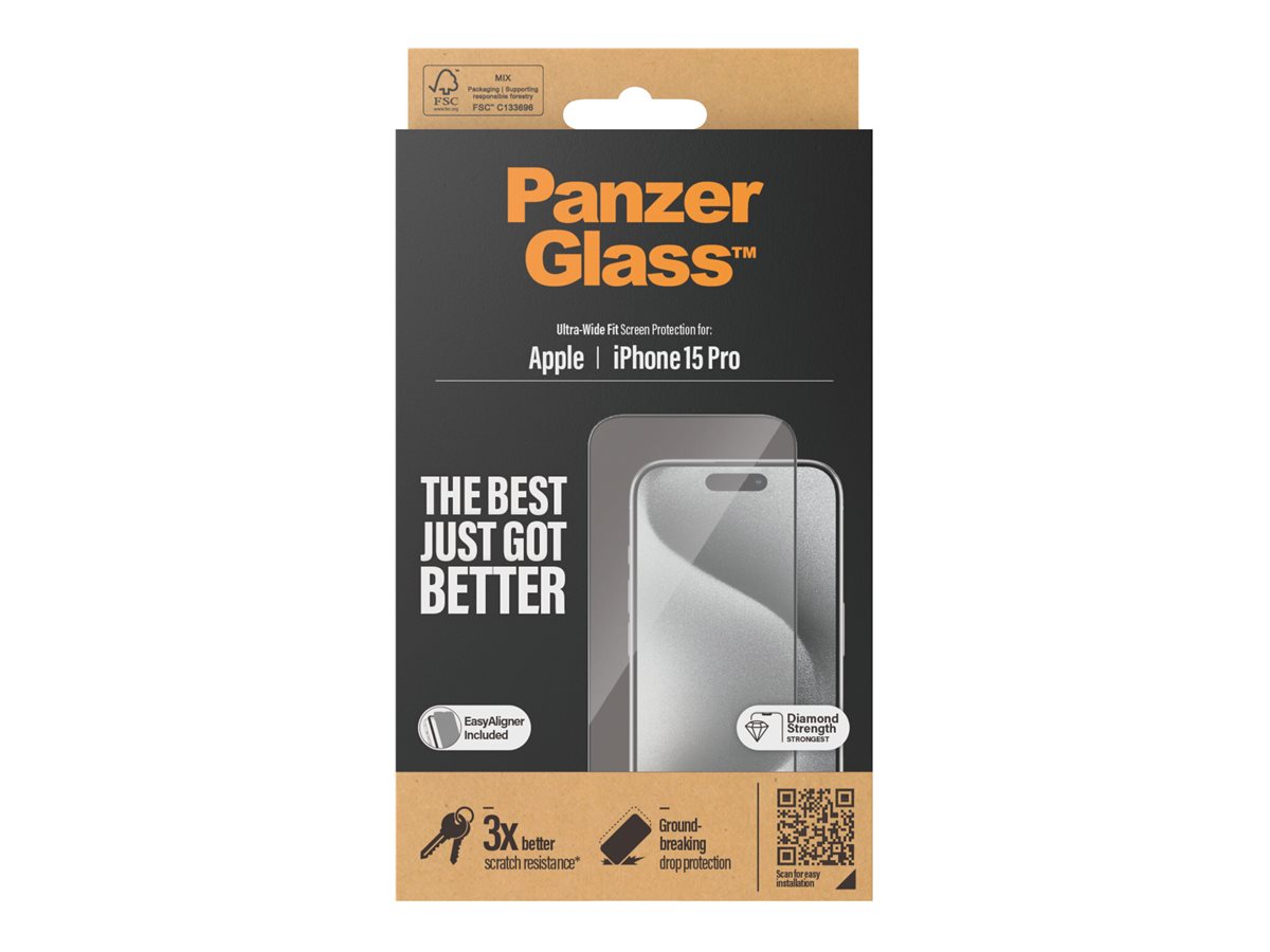 PanzerGlass | Screen protector | Apple | iPhone 15 Pro | Glass | Clear | Easy installation; Fingerprint resistant; Anti-yellowing | Ultra-Wide Fit