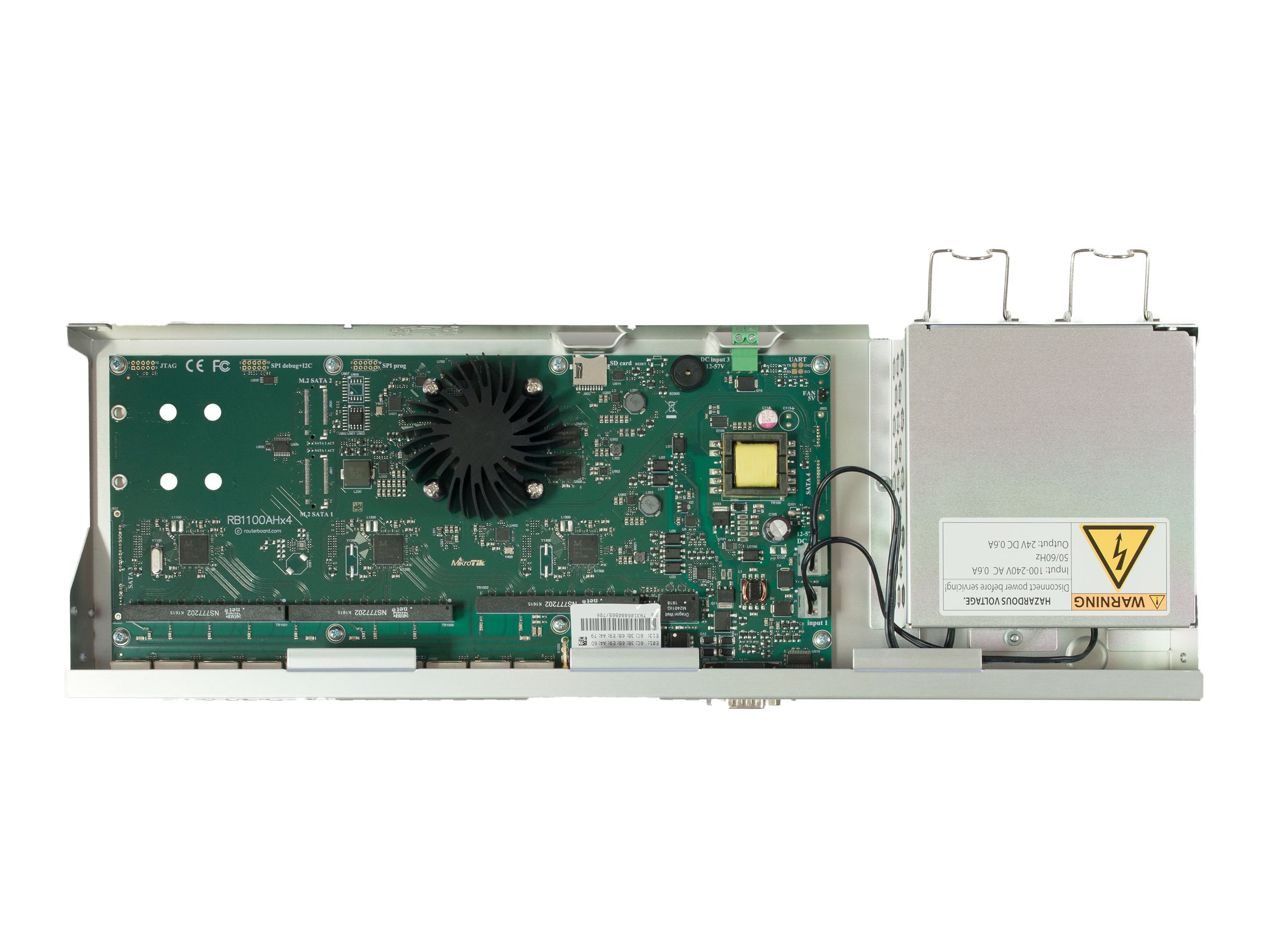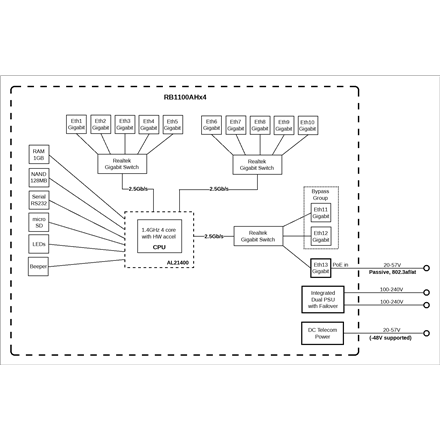 | Other features | Introducing RB1100AHx4, 13x Gigabit Ethernet ports Router, powered by Annapurna Alpine AL21400 CPU with four Cortex A15 cores, clocked at 1.4GHz each, for a maximum throughput of up to 7.5Gbit. The device supports IPsec hardware acceleration (up to 2.2Gbps with AES128). Unit comes with 1U rackmount case, RS232 serial port and dual redundant power supplies (with -48v DC telecom power and 802.3at/af support). |
